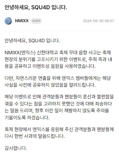 SQU4D今天发出声明,坦承的确在Shinhan University庆典使用了“活动用的音源”,主要是为了炒热气氛,因此也没有告知NMIXX成员这件事情,对于没能考虑到可能会造成观众和外界困扰这点,他们深深表达歉意:“未来我们将更加注意,防止此类事件再次发生。”