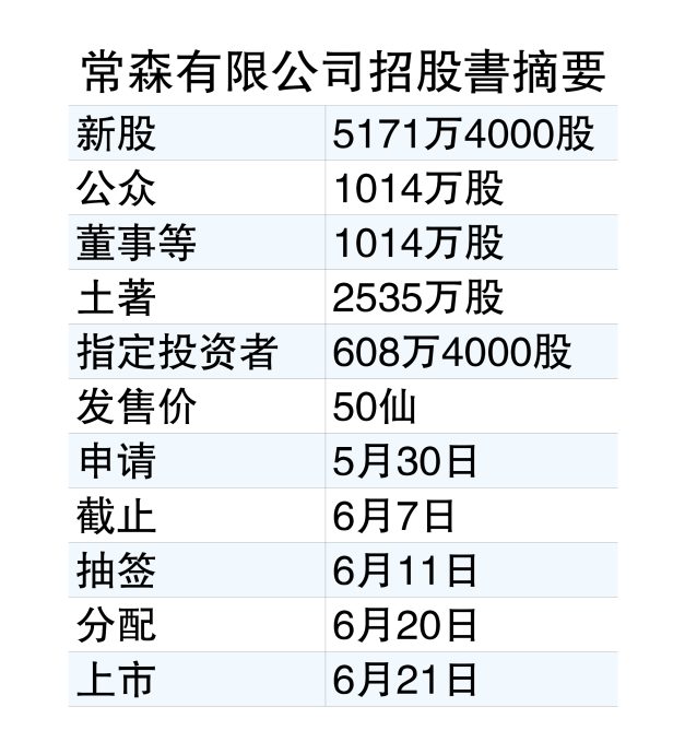 在5171万4000股新股中,1014万股供大马公众申购、1014万股给合格董事、员工及对常森有贡献之人申请、2535万股私下配售给投贸部批准土著投资者,余下608万4000股私下配售予制定投资者。