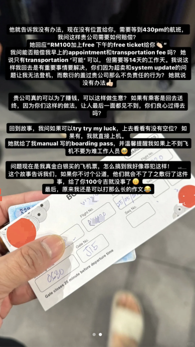 (吉隆坡29日讯)男子申诉,他登机前才被告知飞机已满座,幸他坚持“碰碰运气”,持手写登机牌上机,并成功获得座位!