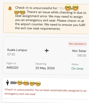 他在社媒“小红书”发文控诉,他一个月前上网订购于5月25日上午7时10分,从吉隆坡飞往亚罗士打的机票,未料前一天线上办理登机手续时却显示“座位安排失误”,无法完成手续。