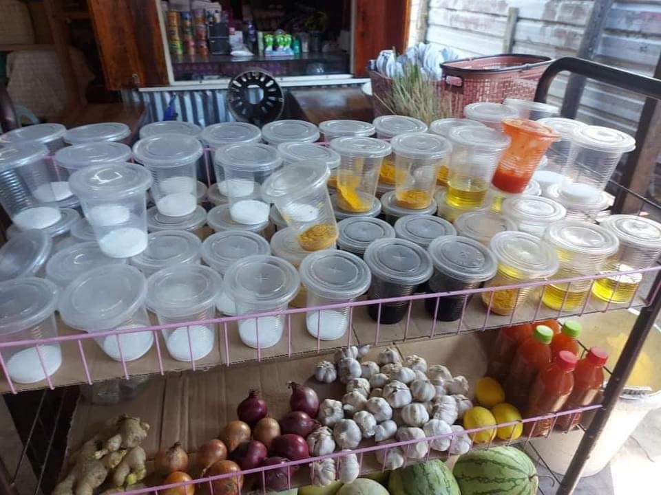 是的,这是位于沙巴仙本那的一个甘榜,一家商店与众不同的包装,商家把分量非常少的盐、酱油、食油和酱料等装在小小的塑胶杯里出售。
