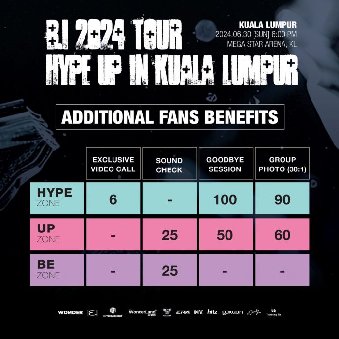 B.I的演唱会票价分为788(HYPE区)、688(UP区)、538令吉(BE区),所有票价未含4令吉手续费,门票可透过 www.ticketingtix.com 购买。不同的票价将享有不同的粉丝福利,欲知更多演唱会详情,请关注Lo-Fi Entertainment 面子书。