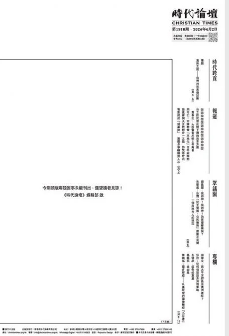 《时代论坛》过往均会在六四前夕的期刊刊登纪念祷文,惟今年最新一期将于6月2日出版的期刊一反以往传统,头版专题报道开天窗。