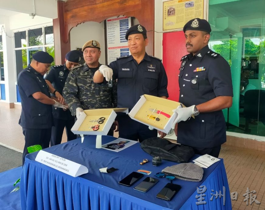 他表示,警方也从嫌犯身上搜索到各种干案工具,计有剪刀、小刀、3个手机、太阳眼镜、2枚手錶和一个冷帽等。