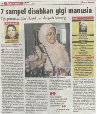 卫生部法医牙科专科主任诺哈雅蒂查化(Norhayati Jaffar)医生,在2009年受委我国第一位女法医牙医,同年也设立了法医牙医组,国内很多重大事件的牙科鉴证都由她操刀,包括有马航MH17、女富商拿督苏茜拉华蒂被谋杀案件、雪兰莪沙亚南牙直利大道(Guthrie Highway)的小型飞机坠毁等案件。