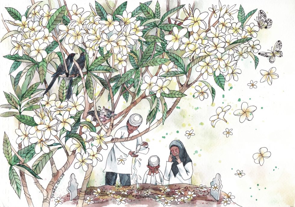 在马来西亚,鸡蛋花也常种植于马来墓园,因此国人常称之为墓园花, “bunga kubur”或“Cempaka kubur”。鸡蛋花不只提供墓园探访者遮荫功能,其独特香气也可减轻往生者尸体腐烂所产生的气味。同时,尸体腐烂的分解化合物也扮演了施肥的角色,让鸡蛋花茁壮生长。除此之外,鸡蛋花还具有在花瓣凋谢前就掉落的特点,其花朵将会完整地凋落在墓地上。根据伊斯兰教义,墓地上的花朵和花香会让往生者感到安宁。鸡蛋花花语是孕育希望,复活和新生。如此说来,一个人的离开可能不是终点,而是另一种生命形式的开始和延续。