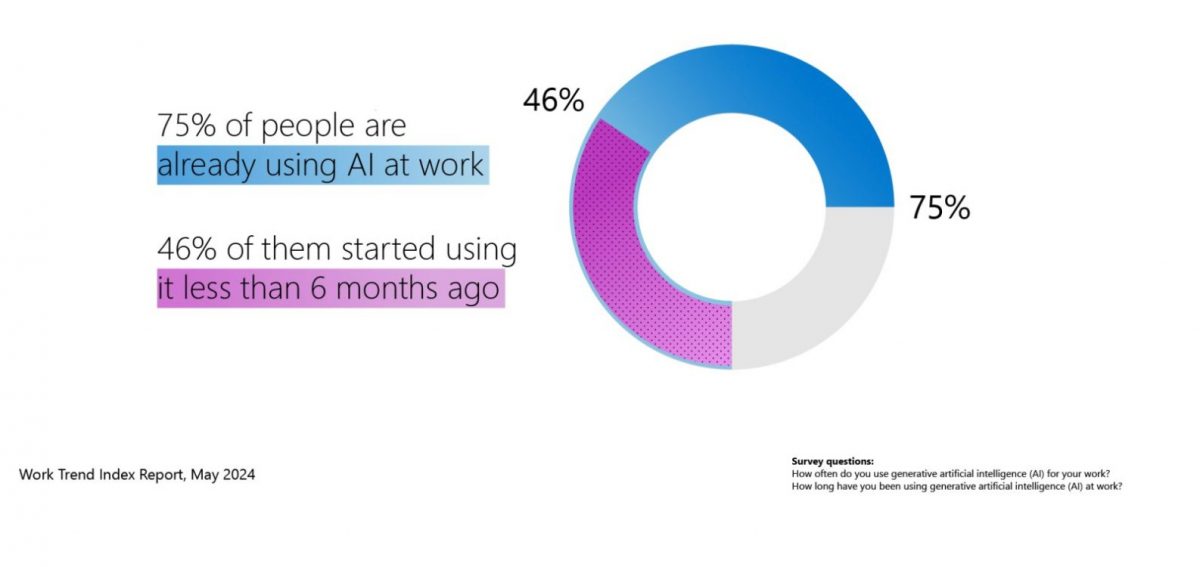 从数据显示,2024年是AI在工作中实际落实及发展的一年。在过去六个月中,生成式AI在工作中的使用量几乎成长了两倍。