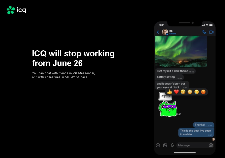 然而,这款即时通讯鼻祖即将在6月26日正式熄灯,告别长达28年的历史舞台。ICQ在官网建议用户转用VK Messenger和VK Workspace,却没有说明能否转移原有的账号资料。