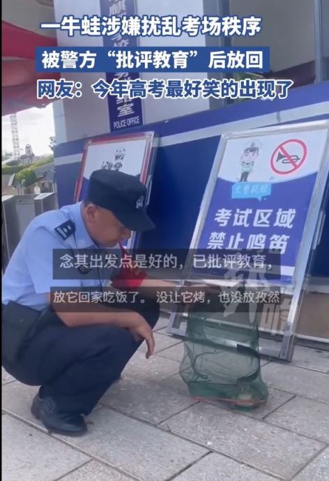 (云南9日综合电)近日中国全国高考正在如火如荼进行中,各地都要求考场周围要保持安静,以便考生可以专心应考,有地方因此要求车辆改道、工程停工。不过当局指出,有一只牛蛙被指制造噪音而被捕,引来网民捧腹大笑。