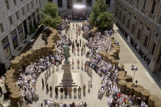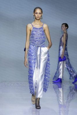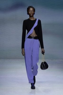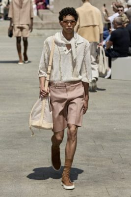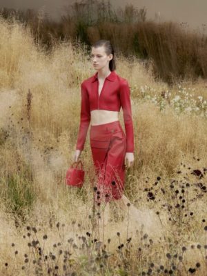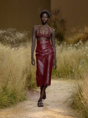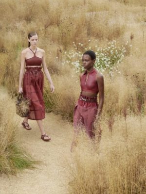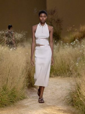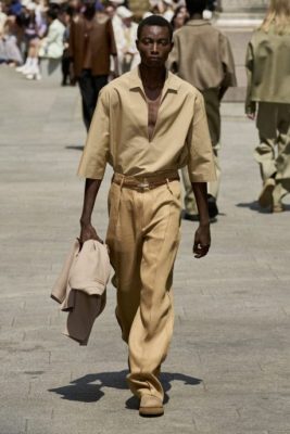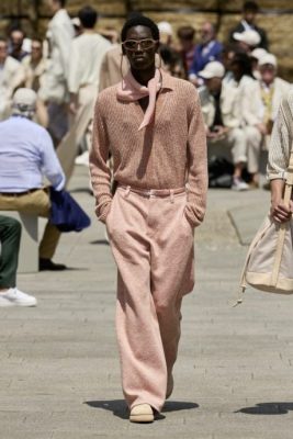 2024春夏时装秀上以192包从诺曼底运来的生亚麻布占据了米兰的一个广场,以历史建筑为背景,制造出城市的一片绿洲。那里种植亚麻,其蓝色花朵在初夏时刻只绽放短暂的时间,演出结束后将重新进入生产链,在意大利制作成Oasi Lino。在艺术总监Alessandro Sartori的心目中,亚麻是灵活的质感能完美地补充他所追求的服装重置,编写了一种流动和适合的新范式;进一步深入探讨创建元素系统的想法,在大都市背景下的自然之梦,以及循环它所传达的价值更具升温。线条看似简单却隐藏了建筑中功能性的元素,使质感脱颖而出。绘制起伏的条纹纹理图案和提花。 纹理针织品增加了面料的质感,进一步凸显轻松感和柔软度。整体的流动性让一切看起来低调奢华,透过细节的张力,丰富的色彩,柔和的精确感奠定了该系列的精髓工艺。