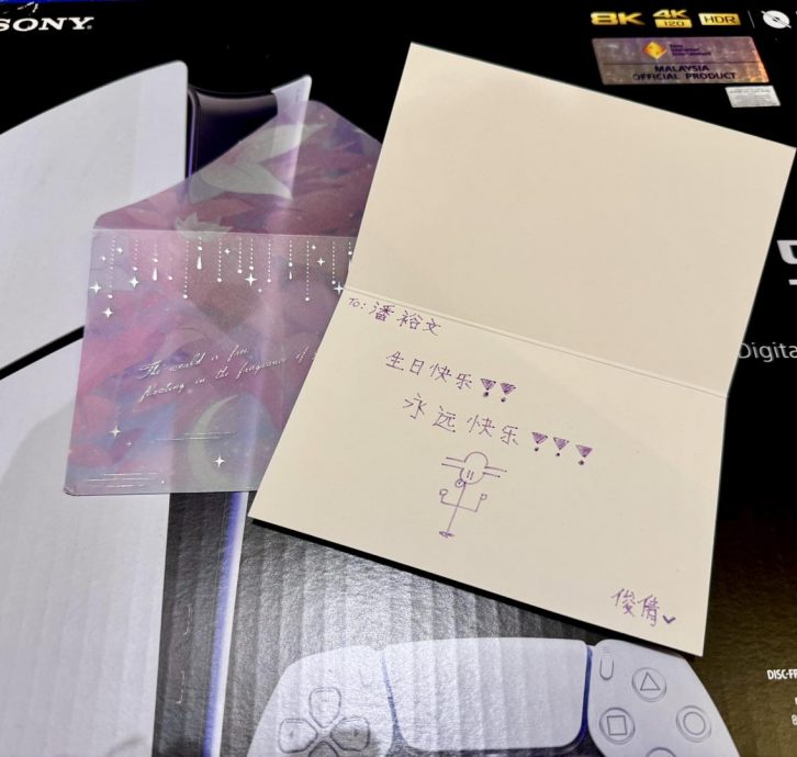 潘裕文在社群网晒出和俊倩十指紧扣的恩爱照,透露女友花了20分钟写了一张生日卡片给他,然而,当他打开卡片时,只看到两行字,“差点笑死,但对于没有学过中文的她而言,确实每一个中文字都是非常困难。”更赞女友“终于没有写错我的名字了”。