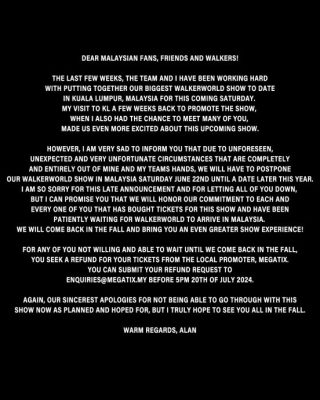 “我为这次迟来的公告以及让大家失望而深感抱歉,但我向所有已经购买门票并耐心等待Walkerworld来到马来西亚的每一位承诺,我们将在秋季回来,为大家带来更加精彩的演出体验!”
