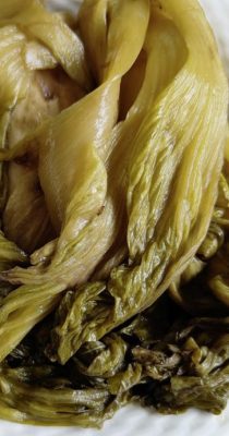 3.酸菜煮之前,必须先用清水浸泡大概2个小时;再冲洗几遍,避免味道太酸太咸。过后,切细段,加入蒜末和小辣椒同炒,加点糖调味即成了很下饭或配粥的菜肴。荤食的话,添入五花肉同炒也是不错的变化。