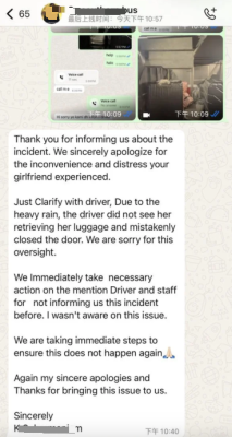 女子也透露,她的男友事后通过WhatsApp向巴士公司投诉此事,客服人员对此表示歉意,并承诺不会再发生类似事件。