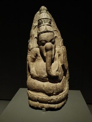 仓库内放有约二十几个架子,每个架子在其横隔上都工工整整地排放着大小不一的存放有标本的木制和纸皮箱子。其内收有自考古遗址内发掘出的各类史前石器,陶瓷碎片,珠子饰物等陪葬品,还包括古人类和其他动物骨骼样本。此外,这里还收藏了不少与砂考古有关的各类历史档案文件和照片。在我工作台旁就放着一尊于1921年在林梦省发现的兴度教象头神石像(图三)。每每在踏入工作室,还未开始研究工作前都不忘双手合十于额前,朝石像膜拜以表恭敬。