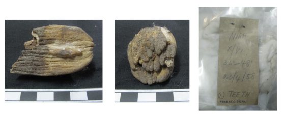这是个动物的牙齿标本,个体不大,可安放于一正常成人掌心之中。可是其外部形态特征却异常明显,无疑是亚洲象一颗颊齿的残端部分。质地脆弱,稍不谨慎,周边结构极易散落,所以也绝对不是近现代动物留下的遗骸。标本袋内还发现有当年发掘时的记录标签。一看标签内容,该标本的发现历史和地点位置即一目了然,一切存疑都消散无影:尼亚洞,发掘坑X/VI,发现日期 1958年4月23日。
