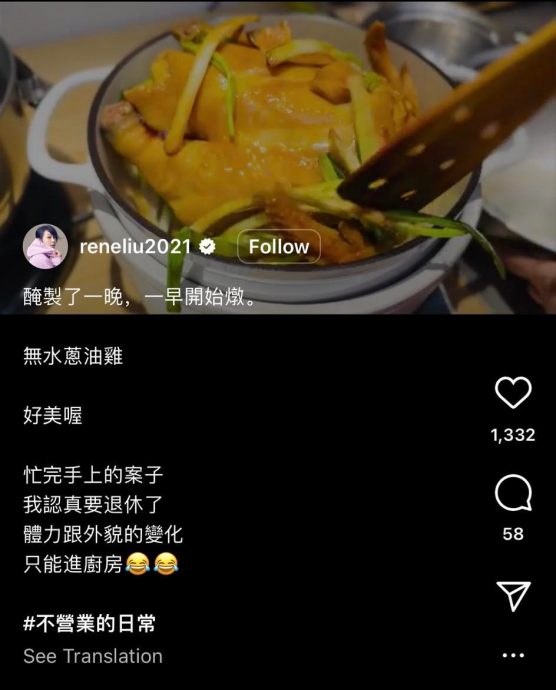 刘若英20日分享无水葱油鸡的腌制到烹调的过程,她忍不住赞叹“好美喔”,之后突然提到:“忙完手上的案子,我认真要退休了,体力跟外貌的变化,只能进厨房。”并附上2个哭到笑的脸。