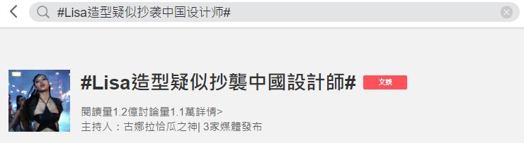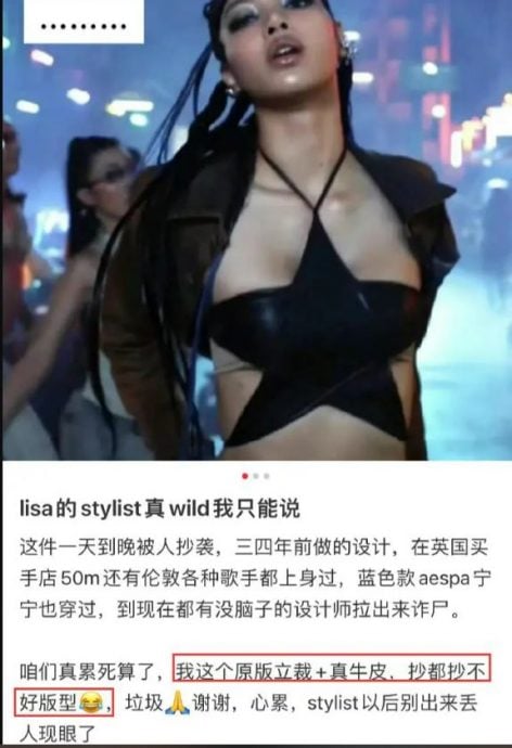 岂料,今日“Lisa团队抄袭”一词突然出现在微博热搜,原来中国有位设计师出面指控Lisa在MV里那套具有设计感、星形剪裁的衣服,是抄袭他多年前的作品,让他直呼离谱,也表示自己已经寄信到Lisa的造型团队。