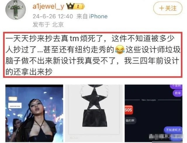 这名设计表示:“一天天抄来抄去真是烦死了,这件不知道被多少人抄过了……甚至还有纽约走秀的这些设计师垃圾脑子做不出来新设计我真受不了,我三四年前设计的还拿出来抄。”