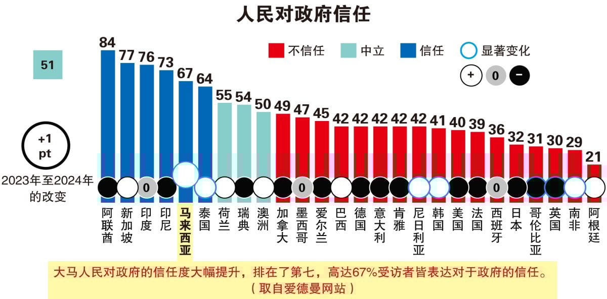 其中调查显示,大马人民对政府的信任度有大幅提升,排在了第七,高达67%受访者皆表达对于政府的信任,得分相比去年上升了13个百分点。