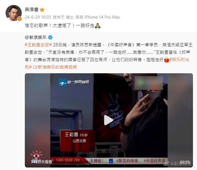 而稍早,庾澄庆也在微博发文哀悼:“难忘的歌声!太遗憾了!一路好走。”
