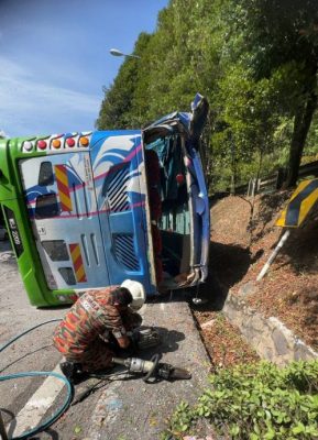 (云顶29日讯)一辆载有21人的旅遊巴士今日上午从云顶下山时翻覆,导致2人不幸身亡。