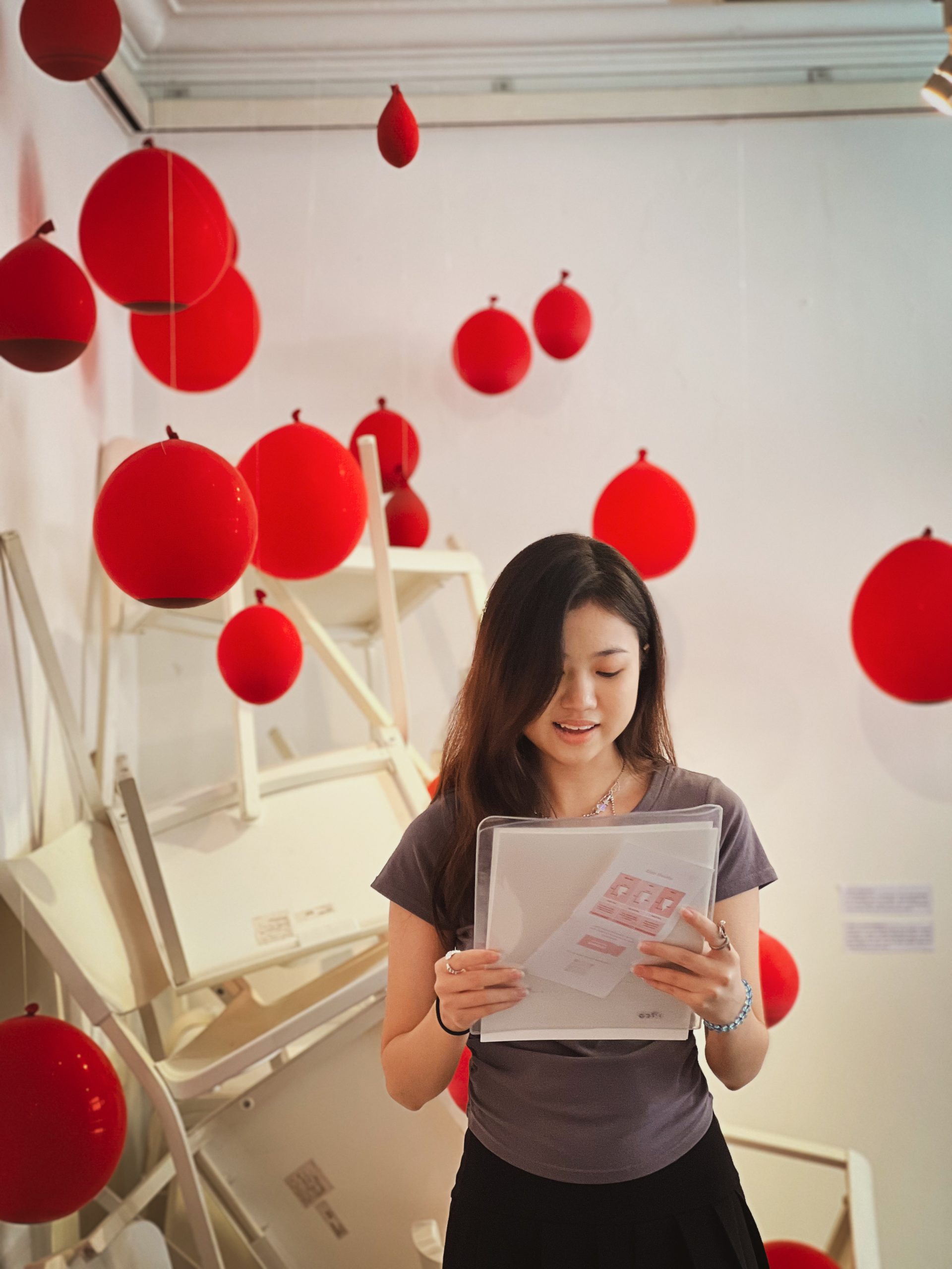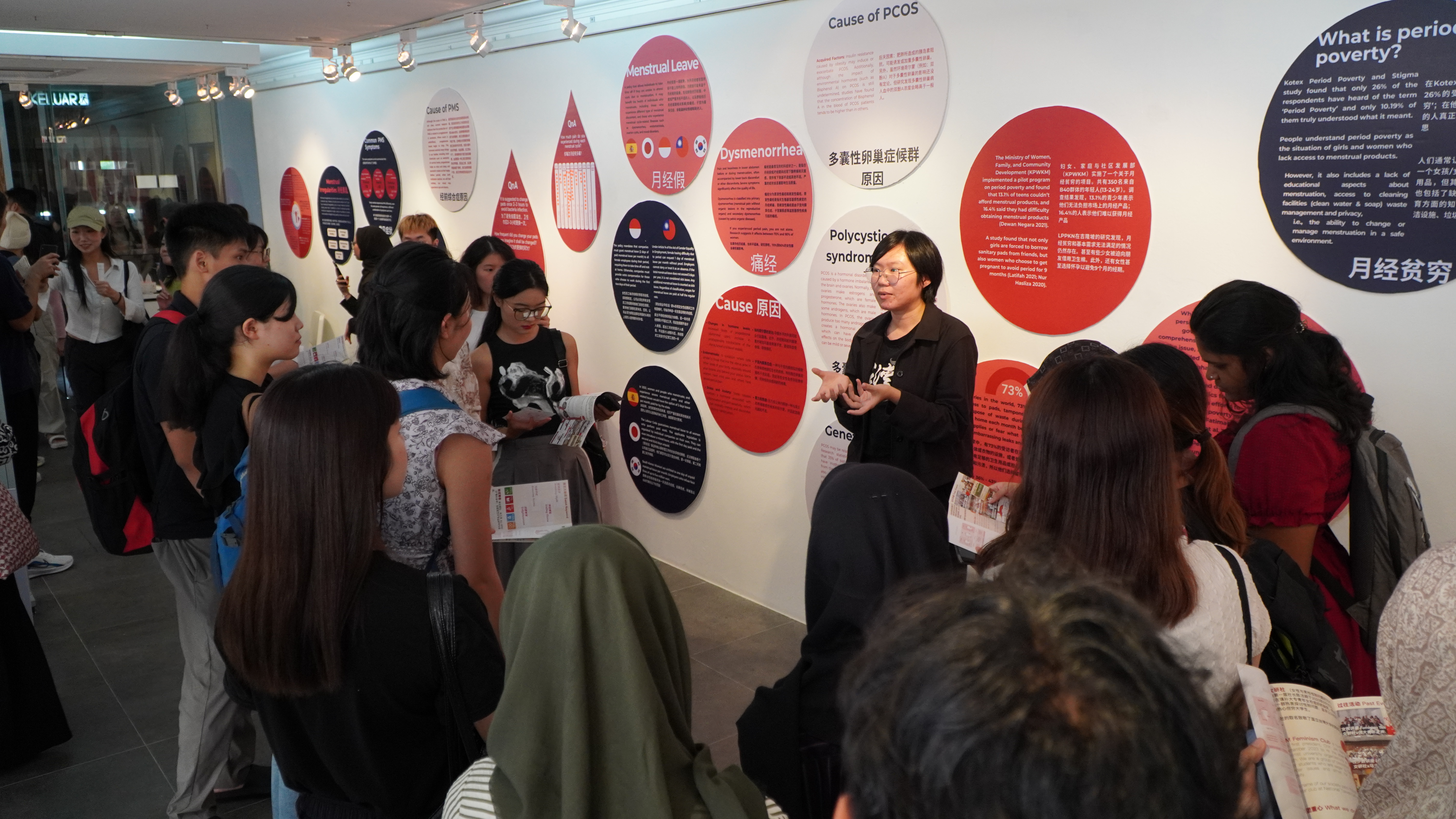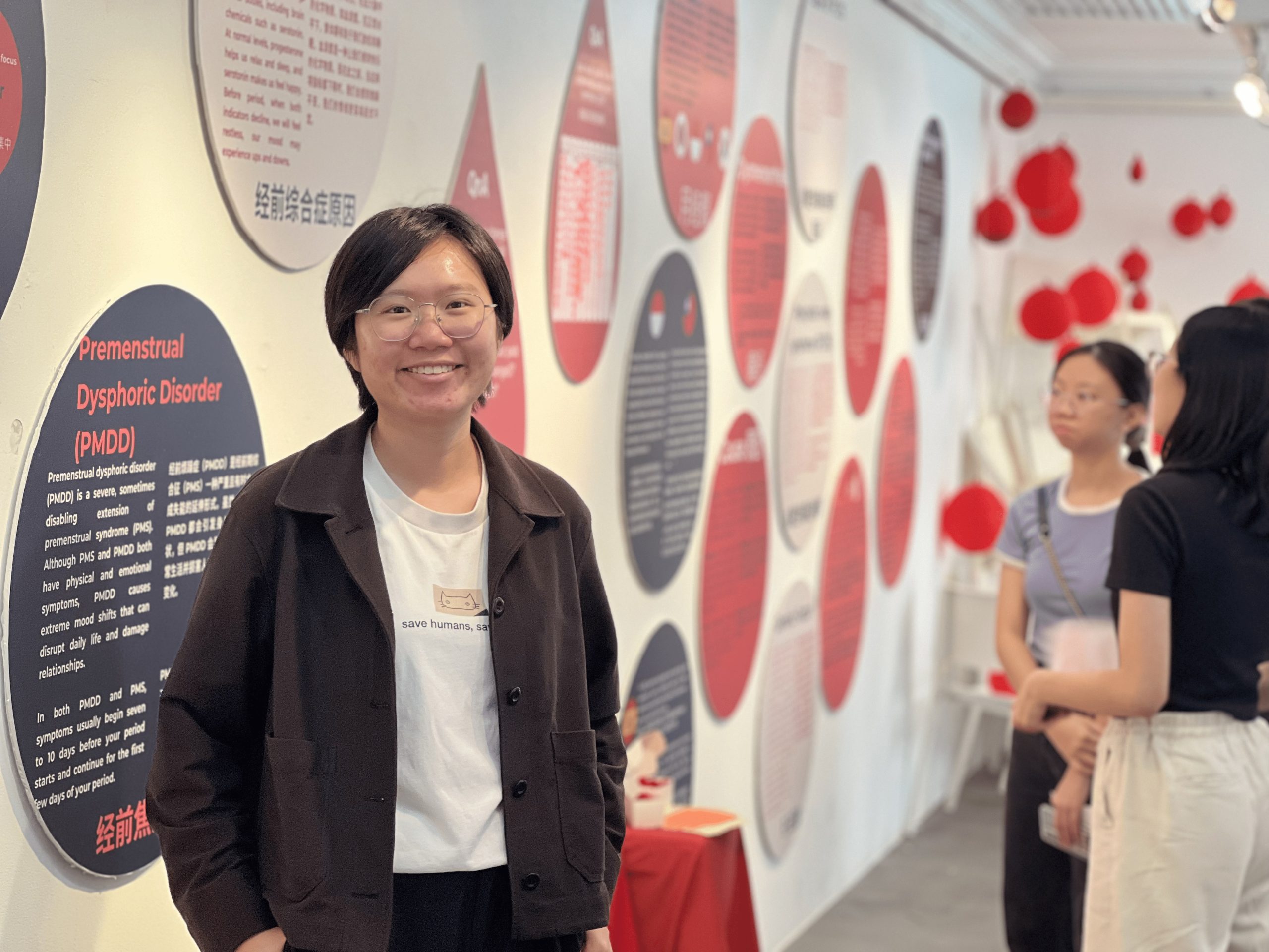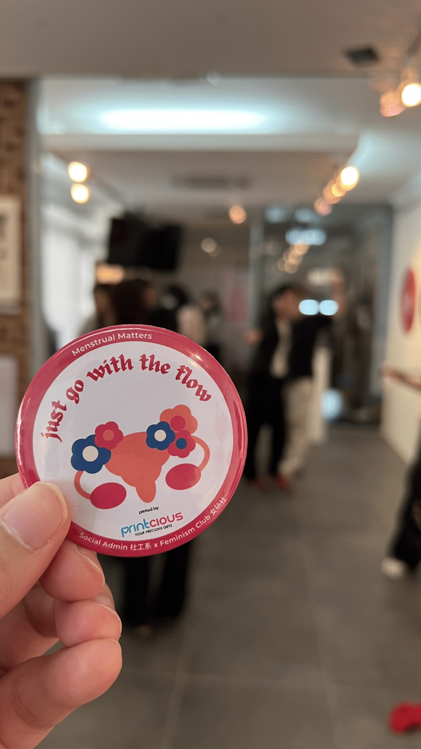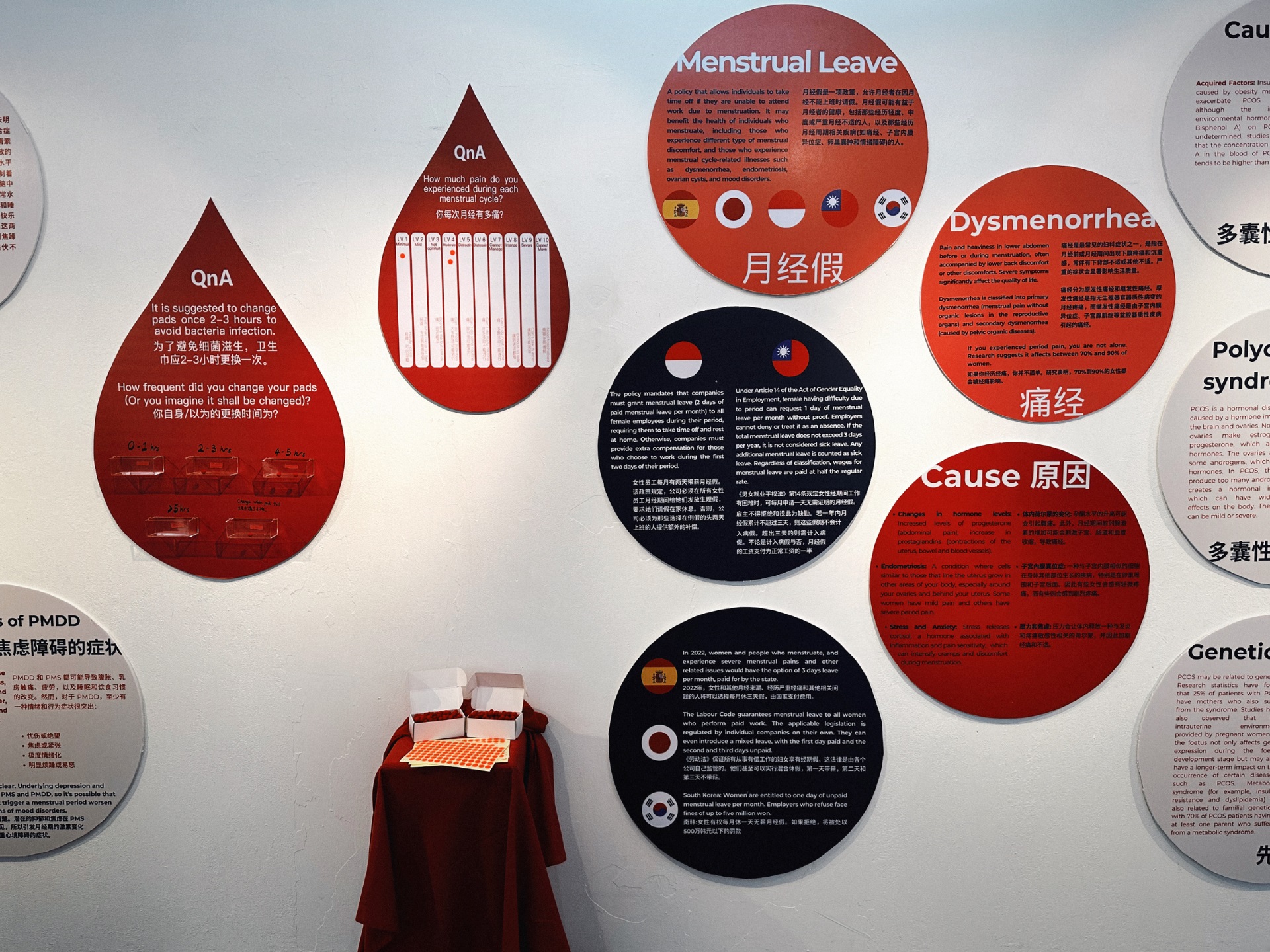 “仅以一抹鲜红,就能宣告我的死刑。” 一名来自外校的学生端正地站在女研社与社工系联合举办的月经展览一隅,现场朗诵她以《月经》为题所创作的的诗歌作品。规模不大的展览空间内,正在观展的数十人顿时静默下来专注聆听。朗诵者的身后是一个以红色、白色相互点缀而成的艺术装置,墙面上张贴的中英文海报讲述着女性生理周期的公卫知识、统计数据、各国政策以及与月经相关待破除的普遍迷思。