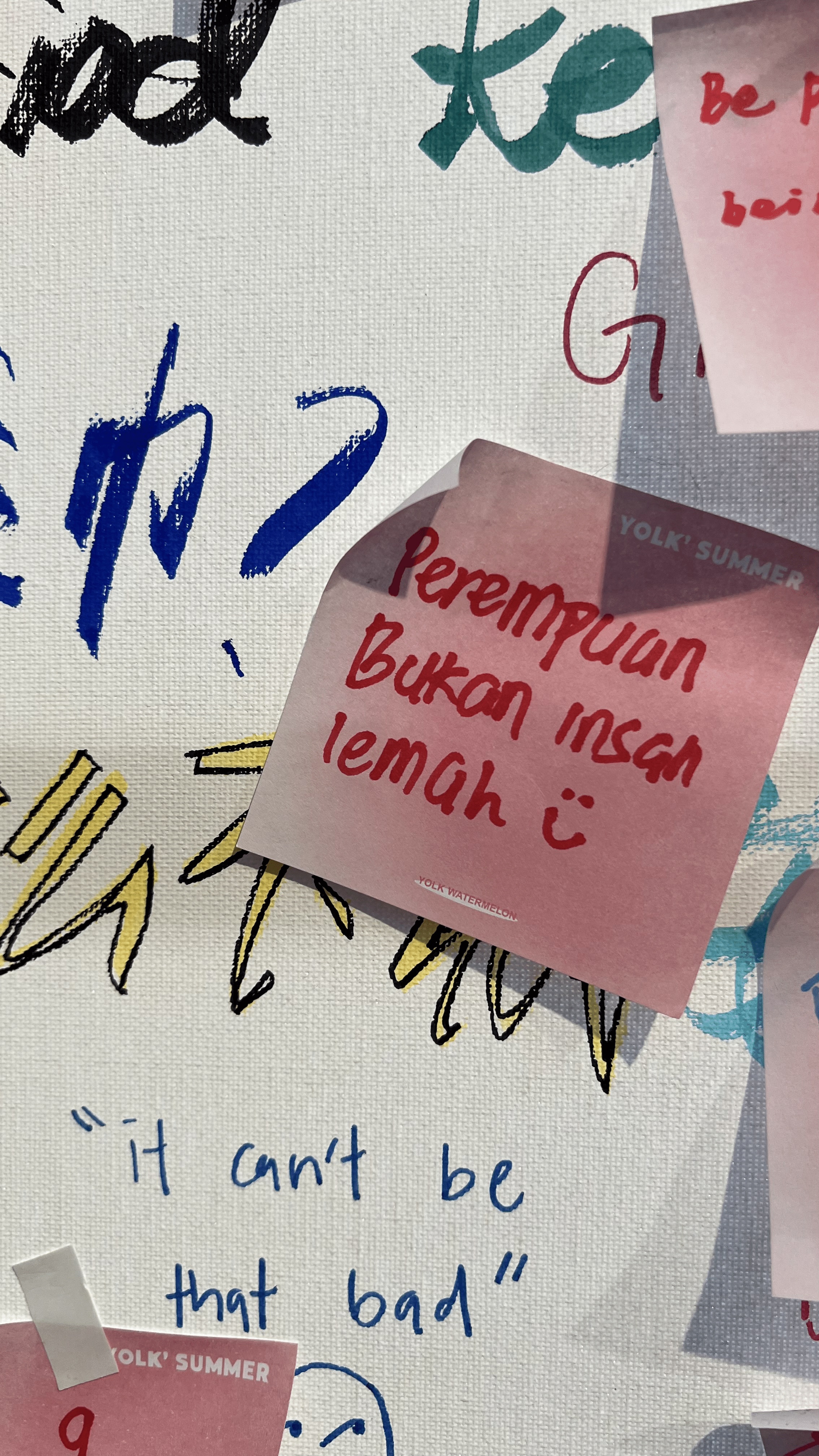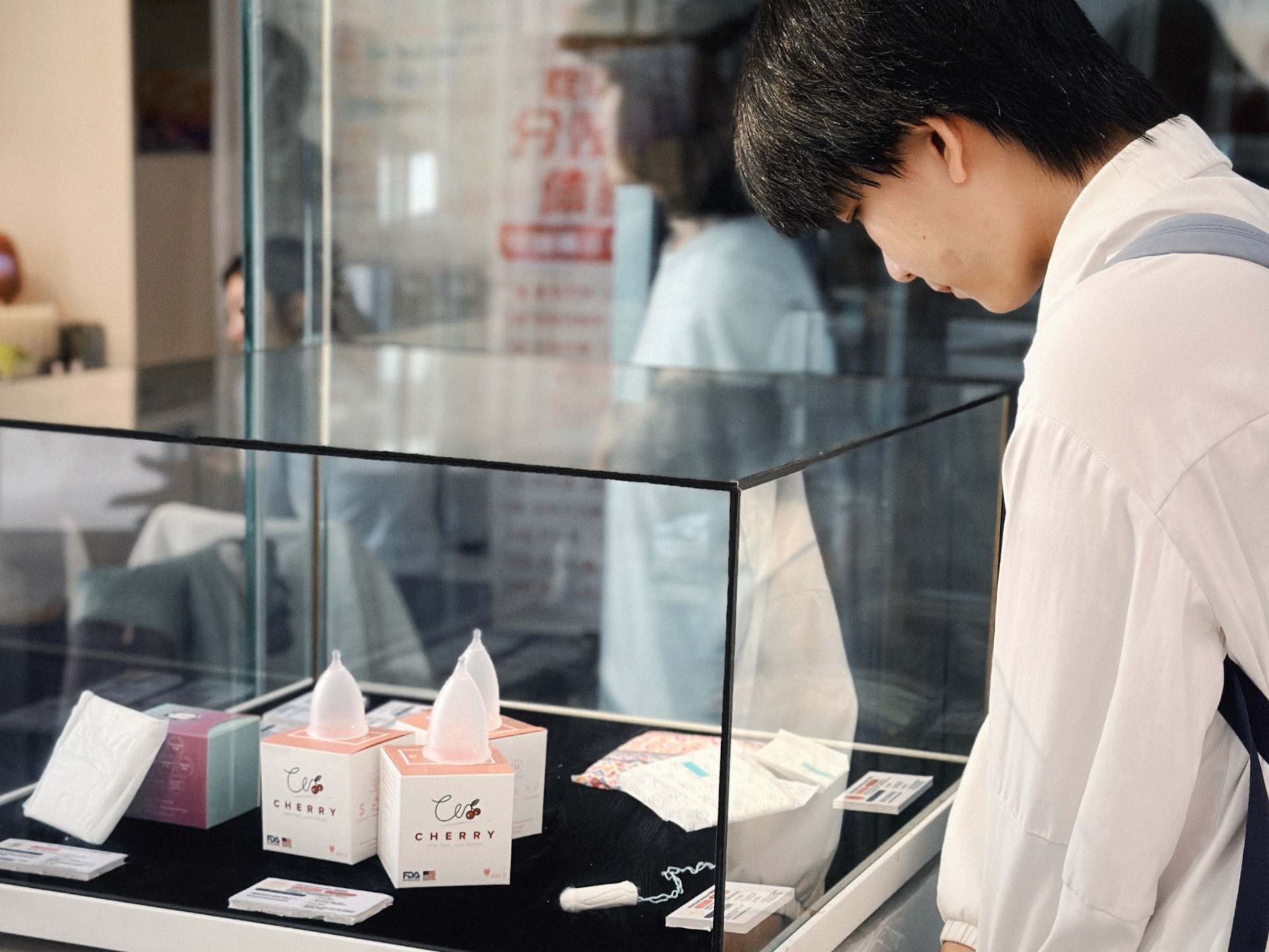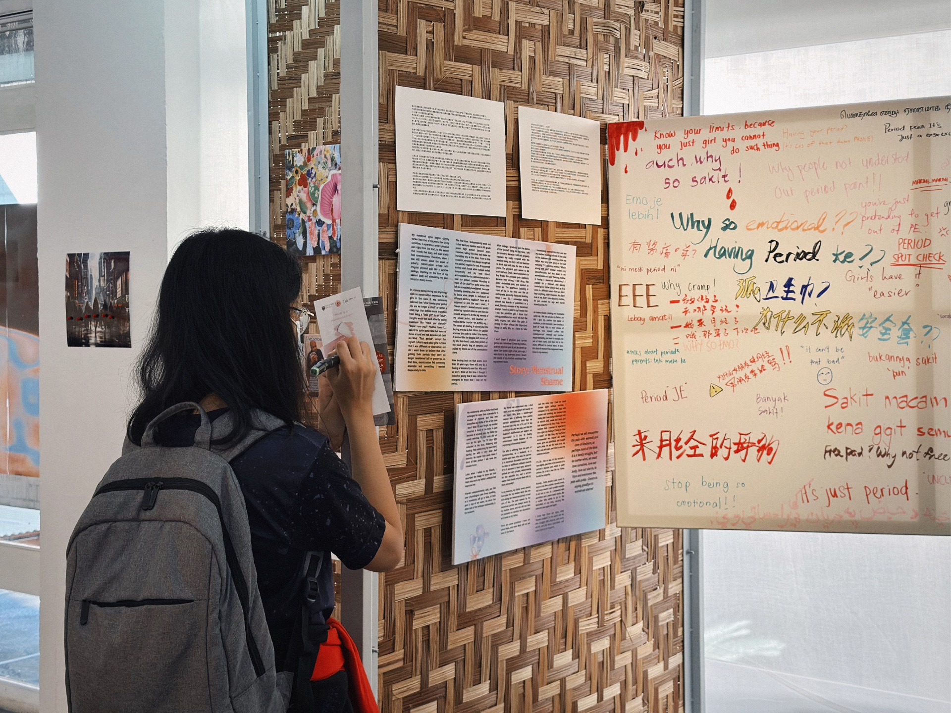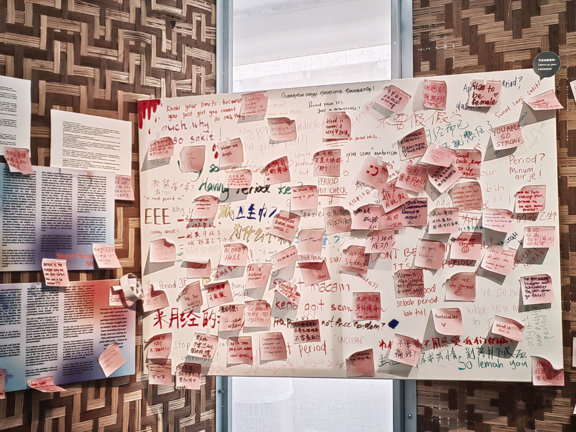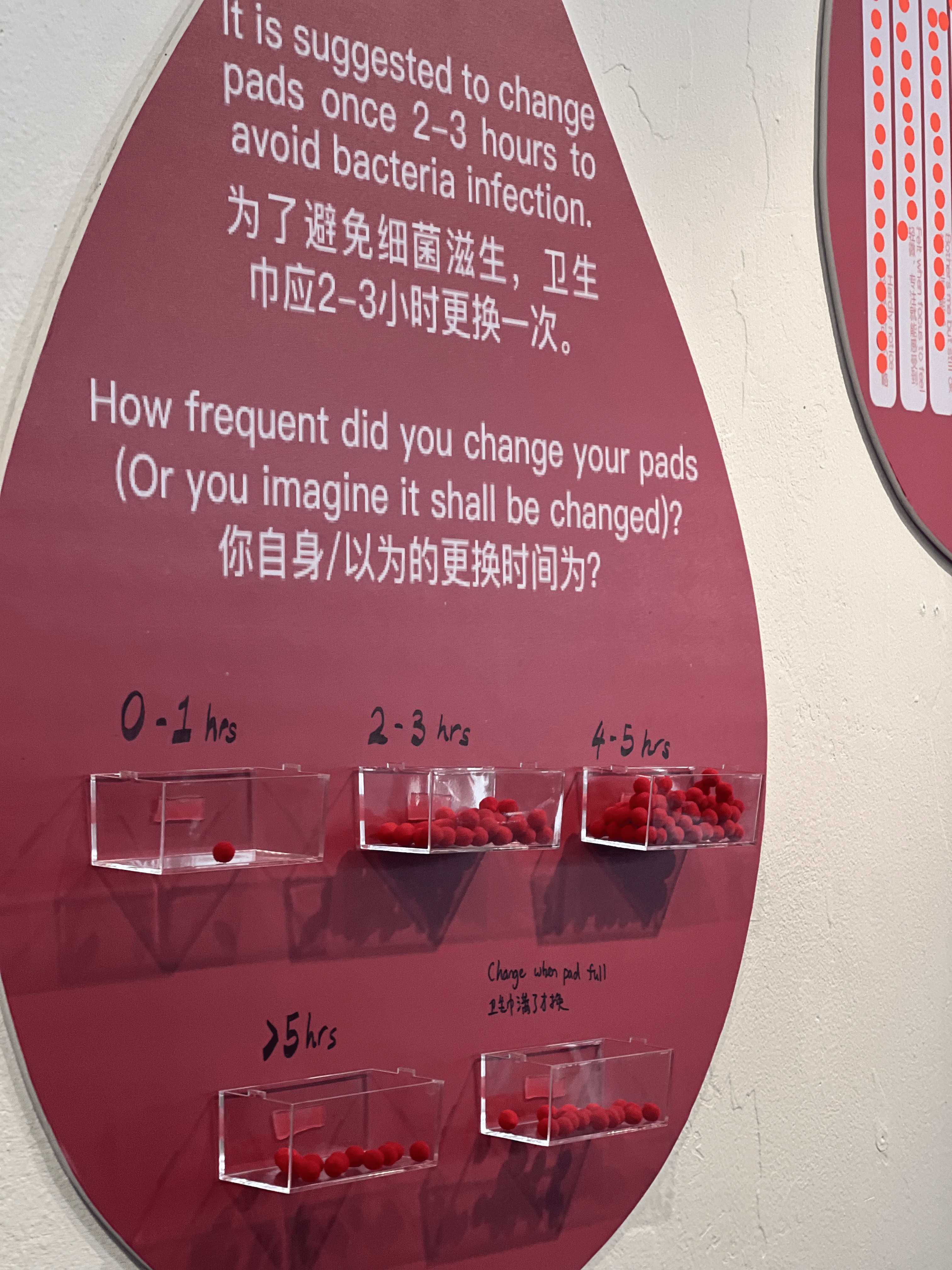 展厅内还设有与访客互动的设计,比如请来访者将红色棉球放入象征不同时长的方格里,有关女性一般多长时间替换卫生棉的问卷调查一目了然。展厅一侧的布告板形成了一面便利贴墙,上面写满了不同访客对于月经来潮、生为女性的想法、感受以及支持鼓励。在资源有限的情况下,短时间内促成一个让观展者感到安全、相互尊重以及可以展开平等对话的空间实属不易,这源自于女研社社员们的用心竭力。