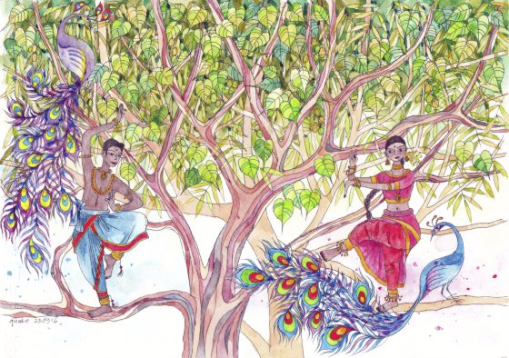 前文提到另一棵在印度寺庙里和苦楝树种成双的树种,这棵树树干粗壮庞大,枝叶翠绿繁密,树皮呈灰色,叶具滴水叶尖似心形,花为隐头花序,在伤口处会分泌出白色乳汁。这树也具有悬垂气根,可直接垂地,入地后长成强大的木质支柱,起支撑和吸收作用,其基部能包裹任何物件、甚至建筑物。