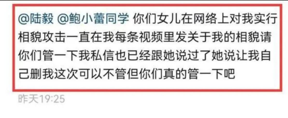 有网民问博主和小叶子是不是朋友,她则回复和小叶子是读同一所学校,本来是朋友,但两人应该是产生矛盾后闹翻,所以小叶子才会在她的视频中留言攻击嘲笑她的长相,沟通无果后,博主才选择向小叶子的父母陆毅和鲍蕾喊话:“你们真的管一下吧!”