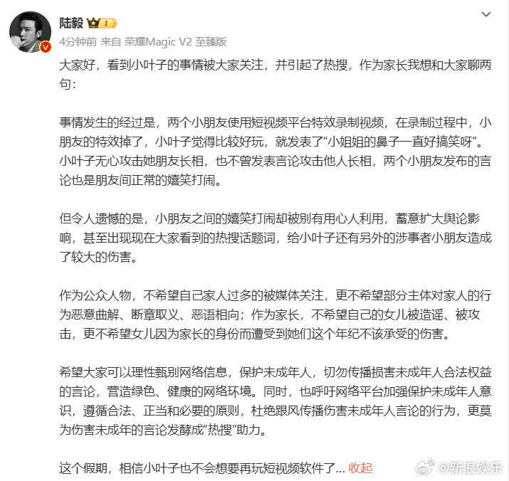 但陆毅的回应发出后,再度引起网民不满和火大,更直接上了热搜前二,没想到随后很快的热搜就撤下了,网民纷纷表示:“陆毅的回应跟没回应一样”、“当事人都不高兴了,陆毅还说是嬉笑打闹”、“护犊子”、“两个人都觉得好笑才称得上是玩笑”、“最后一句好茶啊!明明是他女儿自己先招惹别人,却把她女儿塑造成受害者”。随后指控小叶子霸凌的博主,发文表示将关闭账号,澄清问题出在自己身上,是自己没搞好原因造成误会,希望大家放过所有人。