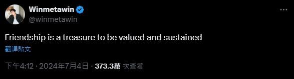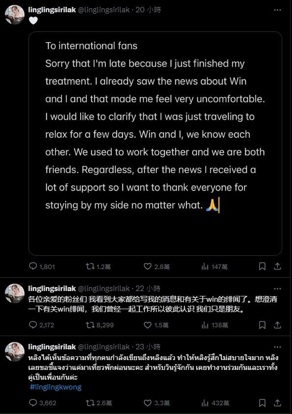 对此,Lingling于4日就透过社群网,并以中、泰、英3语发贴文,她表示:“我已经看到了关于我和Win的新闻,这让我感到非常不舒服。我想澄清一下,我只是去旅行放松几天。Win和我,我们互相认识。我们以前一起工作过,而且我们都是朋友。不管怎样,在新闻出来后我收到了很多支持,所以我想感谢大家,不管发生什么事,谢谢你们一直陪在我身边。”而Win则发文表示:“友谊是一种宝藏。”