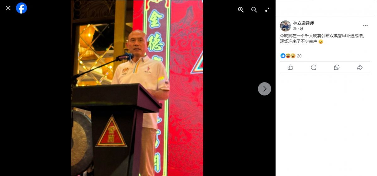 “今晚在一场几千人的宴会上,我宣布双溪峇甲补选结果,获得全场鼓掌。”