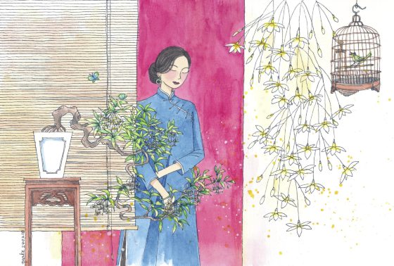 小时候,我常见父亲用细细的铜线缠绕水梅幼枝,引导其生长成理想的形态,待幼枝长粗成型后方才拆除铜线,然后再修剪多余树枝。此过程重复数次,以打造盆栽最终的优美姿态。这培植和创作过程需要漫长的时间和耐心,但这对盆栽爱好者而言是一大成就和喜悦!然而,我比较倾向让植物自由自在地伸展,让水梅随意生长,开花满树,芬芳满屋……