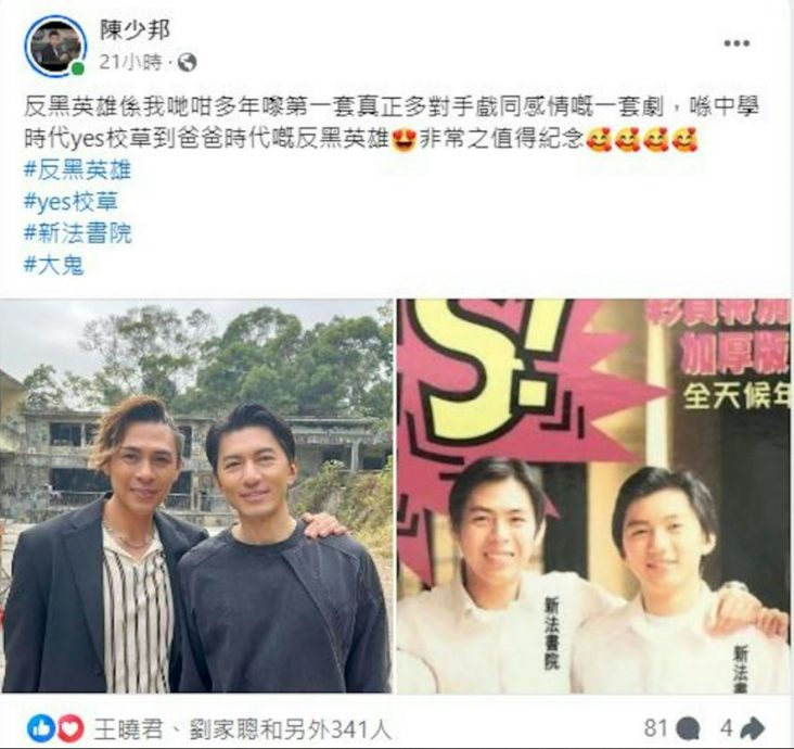陈少邦早前在IG分享跟袁伟豪当年刊登在《YES!!》杂志封面的照片,2人更在拍摄《反黑英雄》时“复刻”同一甫士搭肩拍照,对比之下,两人的样貌变化不大,由昔日的青涩小伙子,到今天相隔27年后,彼此都成为有型、有成就的男艺人、好老公、好爸爸,陈少邦写下:“《反黑英雄》是我们这么多年来第一部真正多对手戏和感情的电视剧,在中学时代yes校草到爸爸时代的《反黑英雄》,非常之值得纪念。”
