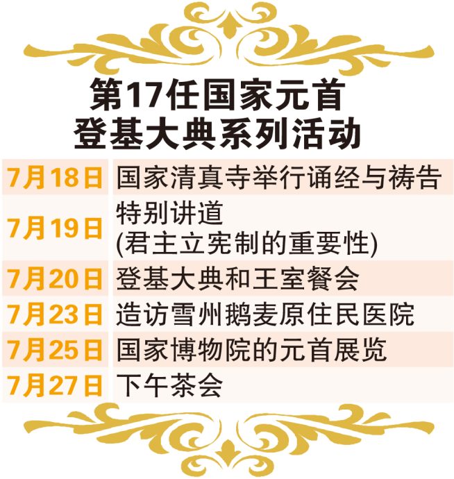 配合登基大典展开的系列活动从7月18日开始,包括在国家清真寺举行诵经与祷告,19日的周五举行特别讲道,解释和提醒所有穆斯林君主立宪制的重要性。