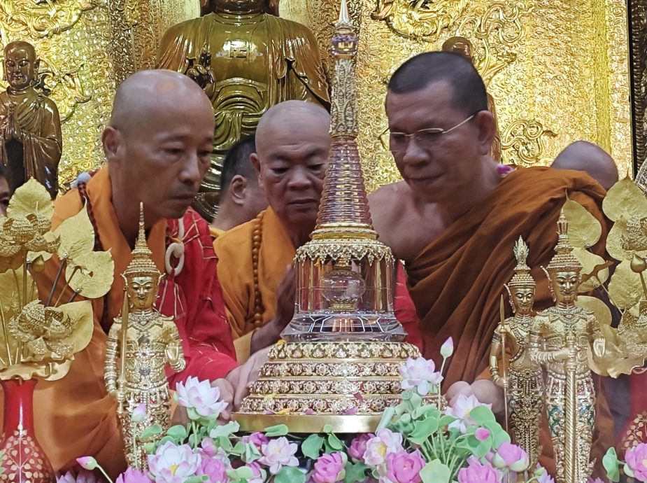 (槟城13日讯)槟城极乐寺今日迎来泰国曼谷二级王室寺庙鸿玉寺赠供佛陀手臂舍利,并供奉在五方佛殿。