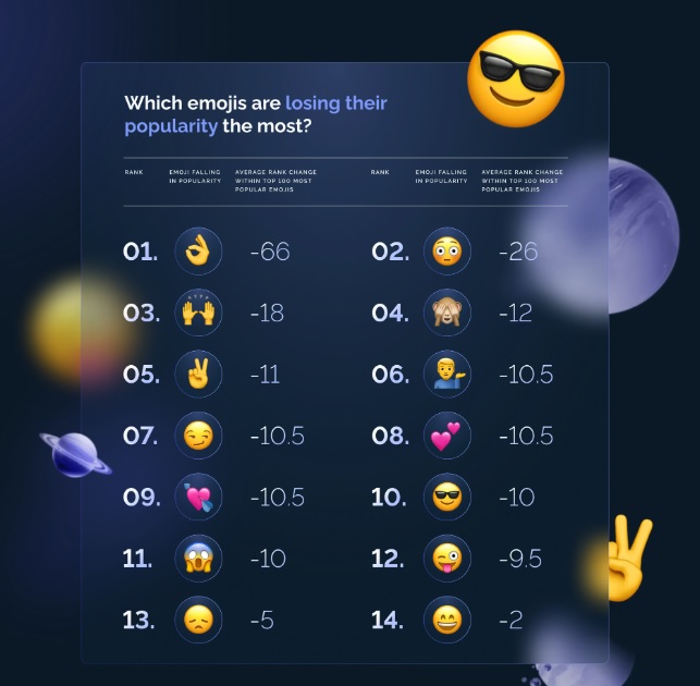 “Superside”分析了全球最流行的100个表情符号使用量和搜索量,发现“OK手势”的使用率严重下滑了66%,“瞪大眼睛的红脸”和“举手庆祝”则分别下跌26%和18%。