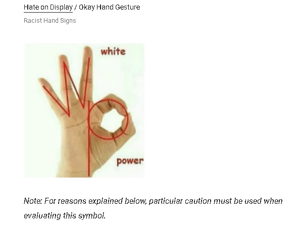 对大多数人来说,“OK手势”表示一切很好、赞同、没问题,看起来很正常。可是,美国反诽谤联盟(ADL)发现,有些白人至上主义者和极端右翼组织刻意扭曲了这个意思,用“OK手势”来代表仇恨,成为种族主义的手势。或许为了避免误解,很多人不再使用这个表情符号。