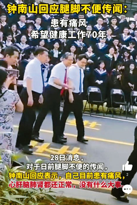 锺南山回应病重传闻 “只是痛风合并感染 走路不便”
