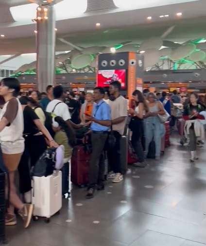 (雪邦19日讯)微软系统造成的航空大当机已几个小时,导致吉隆坡国际机场2号航站楼 (KLIA 2 ) 自助登机柜台无法使用,乘客被迫使用人力柜台办理值机手续,导致机场大厅挤满了人潮。