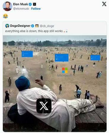 (纽约20日综合电)微软系统周五发生全球性大当机,全球不少用户、企业纷纷回报电脑出现蓝屏死机画面,也导致多家航空公司无法用电脑作业,美国多州的911紧急电话甚至瘫痪无法拨打等,灾情蔓延全球。然而,平台X老板马斯克在稍早贴出梗图,可看出不受影响的他多么舒适的“隔岸观火”。