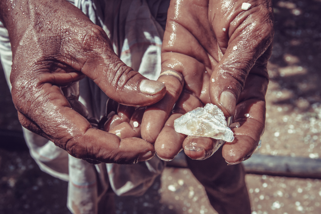 约莫两个月前,拉祖古德的父亲在潘纳市郊一处名为克里斯纳卡利央布尔帕迪(Krishna KalyanpurPatti)的村子租下一个矿场。周三上午,拉祖古德照常到矿坑开工,一切流程仰赖人工作业:“工作单调乏味,我们挖一个坑,把体积大的土壤与岩石挖出来,过筛清洗,然后仔细检查成千上万颗乾燥的小石子,从中寻找钻石。”