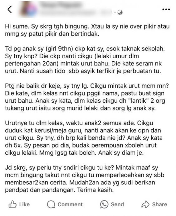 根据网媒“mStar”报道,一名家长在脸书发文控诉,指9岁女儿在学校得充当一名20余岁的男性教师的按摩师,让她震惊不已。