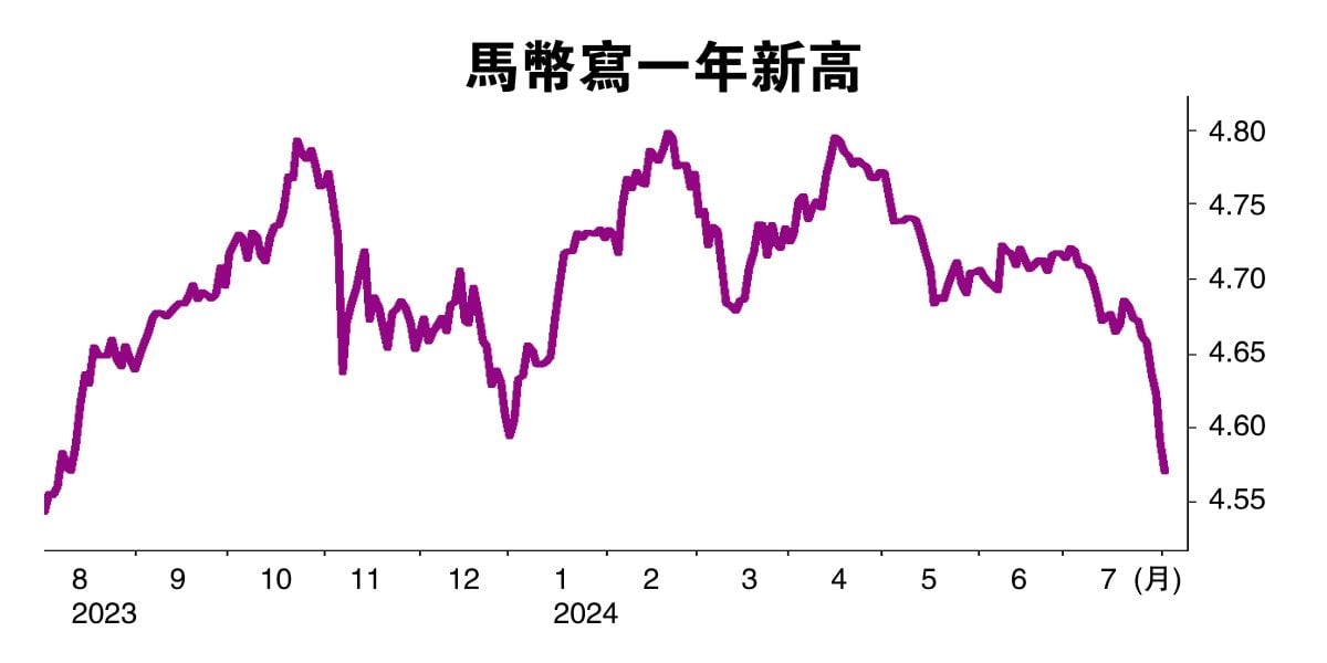 今年迄今马币低开高走,抹平了年初的跌幅。刚结束的7月,马币兑美元汇率共上涨2.7%,至4.5885。