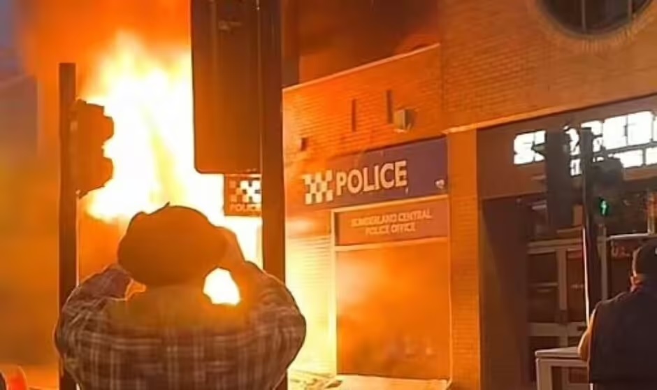 英国广播公司(BBC)播出的画面显示,数百名暴徒在桑德兰市中心胡作非为,袭击警察并纵火焚烧至少一辆汽车和警察局旁边的一座建筑。