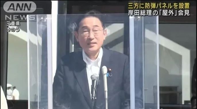 中广新闻网引述日媒报道,岸田文雄日前在三重县多气町接受各家媒体采访时,使用了竖起三面防弹玻璃的讲台。岸田发言时,前方和左右两侧都被护住。