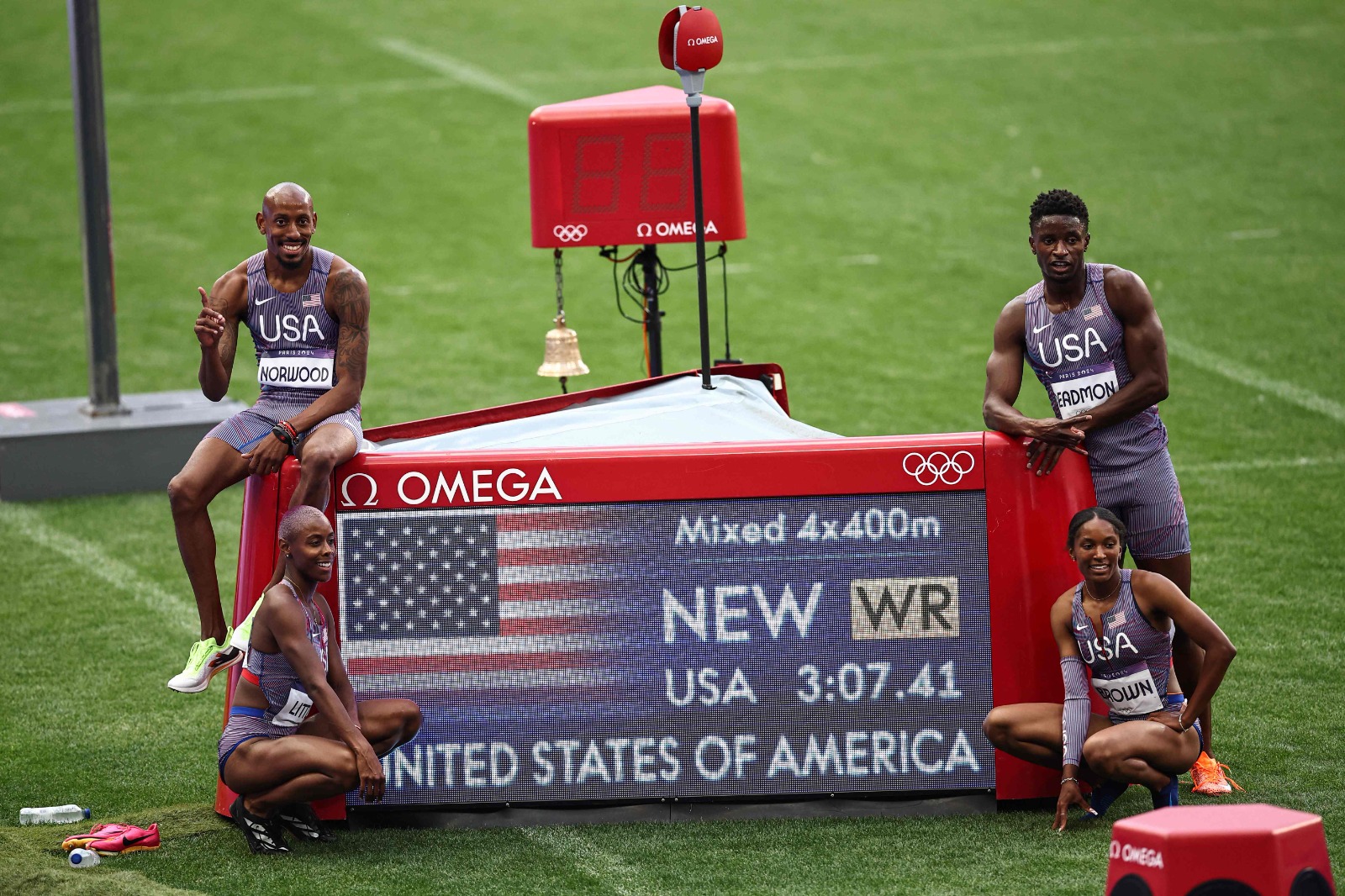 (巴黎3日综合电)实力雄厚的美国队,週五在在巴黎奥运会田径赛4X400公尺混合接力预赛中,以打破本身保持的世界纪录获得小组第一。