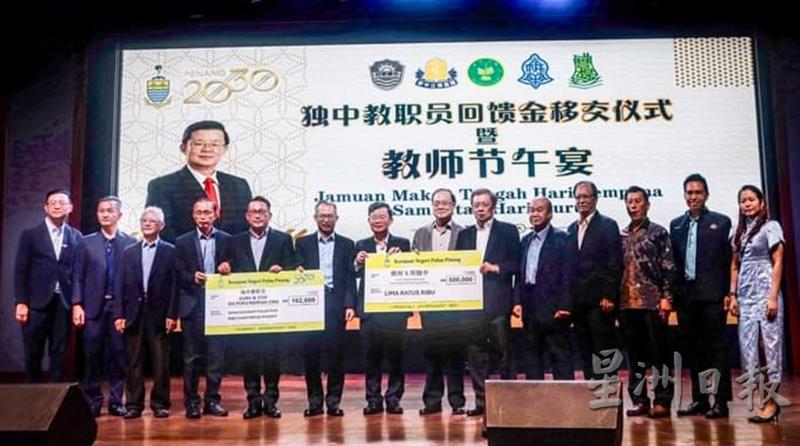 (大山脚讯)槟州政府为感谢槟州全体独中教职员对教育的辛勤付出,日前在日新独中怀德堂举办独中教职员回馈金移交仪式暨教师节感恩宴,槟州首席部长曹观友主持仪式。