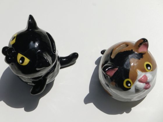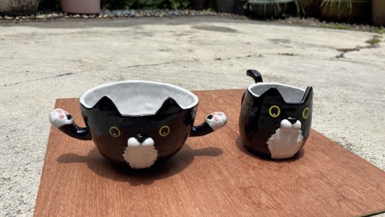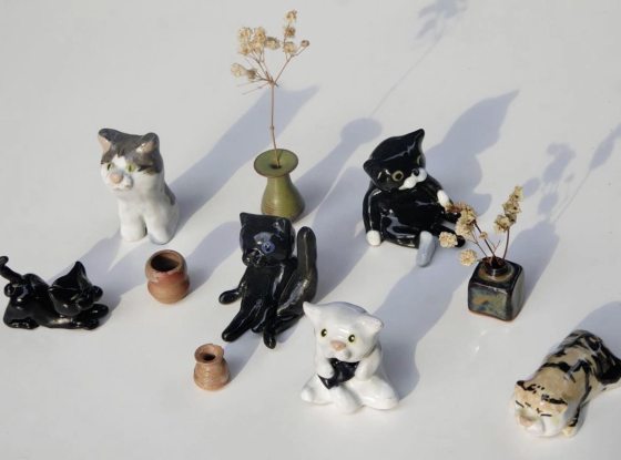 在陶艺店打工将近两年,纯美术毕业的她毅然决定做自己喜欢的事,于是在家捏陶、烧陶,专做猫,她笑说因为本身喜欢猫。先前,一直以画画为主的她画作里并不见猫,那时做雕塑的机会比较少,后来,机缘巧合下有机会接触陶艺,发现自己颇有兴趣,所以将两者结合起来,做了很多以猫为主的物件,而且,她发现现今很多人喜欢养猫,无论任何族群都很喜欢猫,一旦看见人们怀里抱着猫便跨越种族藩篱,自然而然就侃侃而谈。